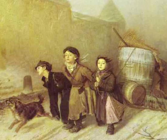 Perov travelled abroad in 1862. Perov lived in Paris during the early 1860s studying art. He not only studied in Paris, but was an active painter. He workeding mainly in Paris, where he painted a series of vivid genre scenes of city life. While Perov is a Russian artist, his time in Paris leave us many scenes of Paris life. Some of the street scenes show us how pooer French children dressed. The images all show the street children, presumably the offspring of working-class children wearing long pants. One boy is pictured wearing a bert. We know rom fashion magazines the children from more affluent families were by the 1860s wearing kneepants.