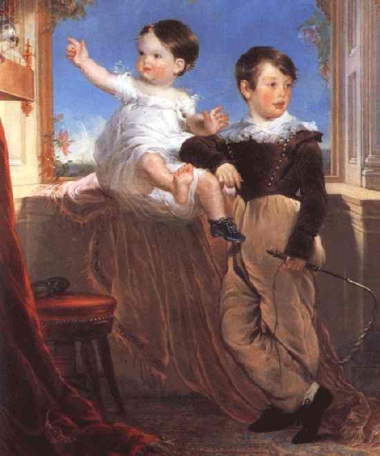 HBC at this time has virtually no information on English portratist John. R. Wildman. We do know that he was active during 1823-39. We know of one charming portarit of children showing a boy wearing a skeleton suit, John Strange Williams. John is pictured with his sister Sarah Ann. Theu must have come from a prosperous family to have a portrait done. John wears a classic skeleton suit. The 1830s was the last decade that the skeleton suit, which has appaered at the end of the 18th century, was a fashionable style for a boy, but the style lingered through the 1840s. Notice the bagginess and klength of the trousers. Trousers worn with skeleton suits in the early 19th century would have been more trim fitting and extended only to above the ankle. We are unfamiliar Wildman's complete body of work. This portrait comes from London's Guild Hall. The National Portrait Gallery in London also has a Wildman portrait, but in 2001 was not on display. It is another portrait.