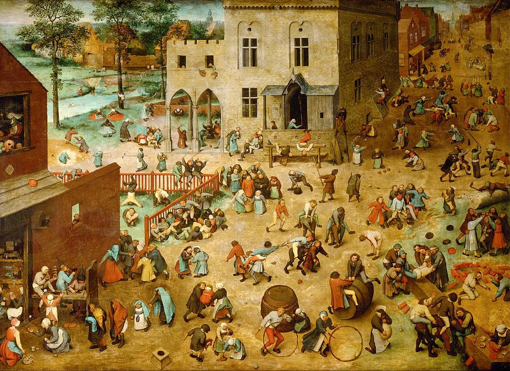 Pieter Bruegel the Elder was born in Brenda (modern Netherlands) or Bree (modern Belgium) (about 1525). He was Netherlandish/Flemish Renaissance painter and printmaker known for both landscapes and genre work. He showed a special interest in peasant scenes which is why he is known as 'Peasant Bruegel' as thre are several different members of the Brueghel artistic dynasty. There are different spellings of his name. He dropped the 'h' from his name and started signing his paintings as Bruegel (1559). As a boy he was apprenticed to Pieter Coecke van Aelst, whose daughter Mayken he later married. He traveled in France and Italy, and then spent some time in Antwerp. It was here he was accepted as a master in the painter's guild (1551). He then traveled to Italy again before returning to Antwerp whre he worked for 10 years. He finally settled in Brussels. Art historians see him as the greatest of the Bruegel clan. His life is almost coincident with the Reformation ans the influence of the Reformation is powerful. This can be seen in the humanizing spirit to traditional subjects and bold innovation, especially the value he gave to individuals, especially those of the lower order. No one embraced the peasantry like Bruegel. He is of special interest to HBC because of his wonderful painting of peasant children playing (figure 1). It is not an actual scene, but a canvas for depicting the varied play activies of peasants in the 16th century.