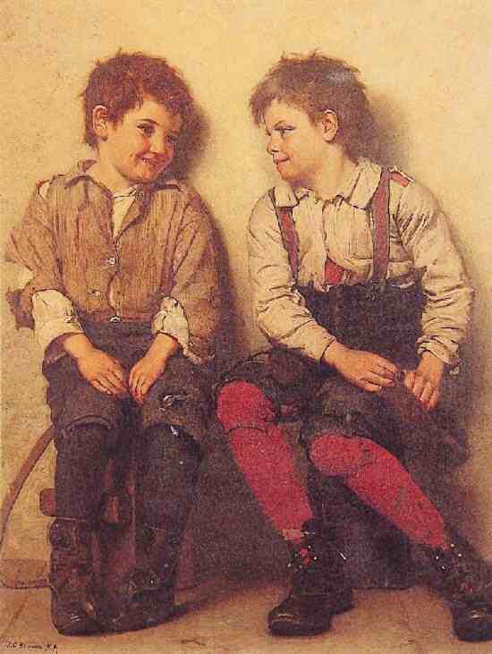 ![]() Figure 1.--I'm not sure what the title of this John G. Brown painting was. Both boys wear kneepants and long stockings. Notice the patches on the red long stockings. |
