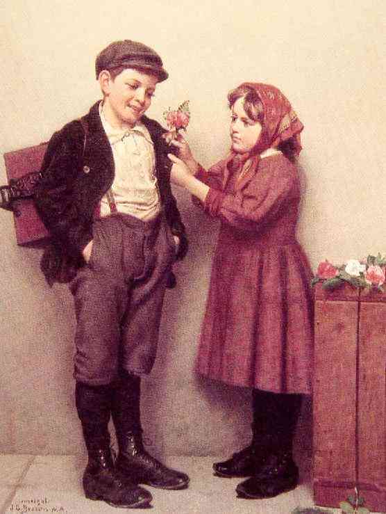 ![]() Figure 1.--This John G. Brown, "The button-hole posy" was painted in 1894. It shows a hoe-shine boy getting a posy from a flower girl. |