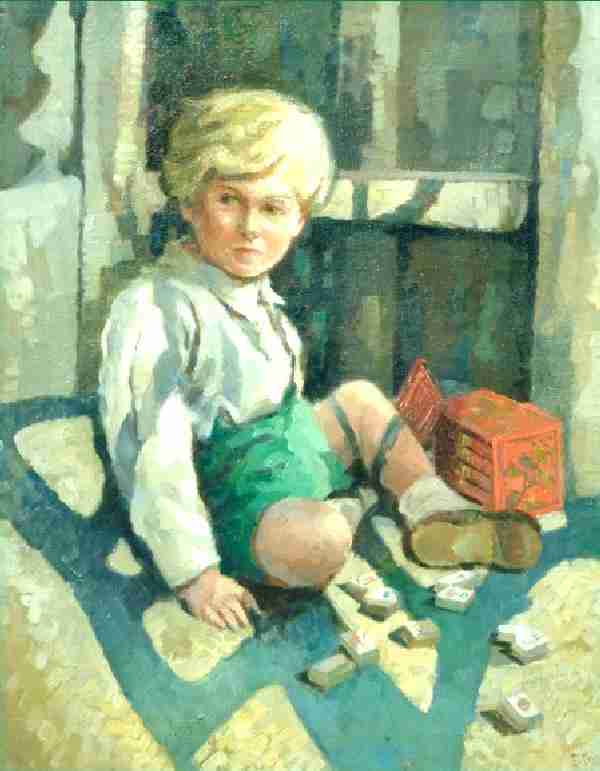 We note a figurative painting by E. Collier done in 1939. It is in a post expressionist or post modernist style of a boy playing with g with a mah-jong set, a popular game of the time. The tiles are scattered on the floor at his feet. There is a red lacquered workbox at his side. The boy is sitting on the floor wearing a white shirt and green shorts, having blonde hair and looking towards the artist. The painting has been executed with a number of techniques. For the background, the paint has been applied in a textured, almost cubist fashion, in horizontal strokes and then in stroked parallel with the textures of the carpet. We know nothing about the artist at this time.This technique has also been carried through to the background although it has been used in a free manner to produce the textures and effects of light and shade. It is oil on canvas and is signed "E. Collier in the bottom right hand corner and is dated 1939. This is a wonderful piece of mid 20th Century British art.