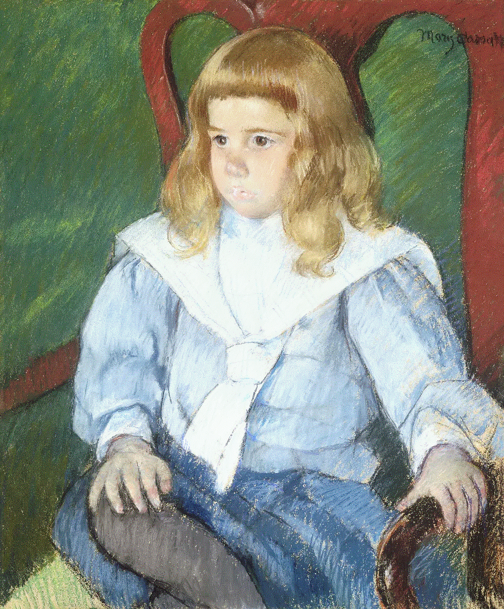 Cassatt's first works in France incorporate popular conventional Spanish and Italian themes. Cassatt by the mid-1870s began to show the influence inovative new artistic aproaches--Impresionism. Cassatt arranged a few showings of her work in a few mixed exhibitions in America. They were generally favourably received by American art critics, but here unconventional style was not without critics. The rejection of "Portrait of a Little Girl" (1878) for the American section of the 1878 Paris Exposition Universelle reportedly enraged Cassatt. [Barter] This was an important contribution to the acceptance of Impressionism in America. Cassatt evolved her own very personal style. While ifluenced by Degas and the other Impressionists, she did not just copy their styles. One very important influence of the Impressionists was Cassatt's focus on the the minutia of domestic life. Although Cassatt never married, she loved children. She doting on her nieces and nephews as well as the children of friends. This emotional attachment shows clearly in her work. The loving intimate relationship between mothers and their children are among her most memorable works. Her focus on children as well as her innovative images showing the lives of women have made her the most celebrated woman American artist. These intimate domestic scenes were a major change in the world of art because many important earlier artists had painted works showcasing social movements or actual historical events. "The Bath" (1891) is one of her most well-known works using the mother-child theme. Other important works were 'Portrait of a Little Girl' (1878) and 'Children on the Beach' (1886). We also see a portrait of Harris Wittenmore Jr. (1898) entitled, 'Boy with Golden curls' The Whittemores were a priominent Connecticut family. Harris' father compiled an imoportant collection of French impressionist art.