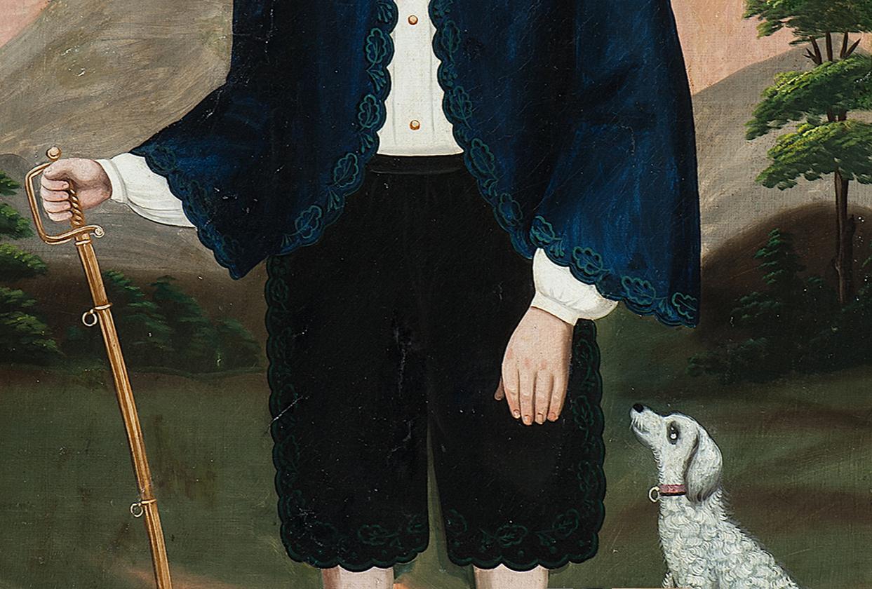 There are some unusual aspects to the boy's outfit. He wears shortened-length pants, very rare before the 1860s. Vuirtually all of the images we have fojund at mid-century show boys wearing long pants. Also notice that he is wearing socks, almost always white, rather than long stockings -- leaving part of his legs bare. That was virtully unheard of at the time. Except if ciourse for children going barefoot. He is accompanied by a poorly painted dog.