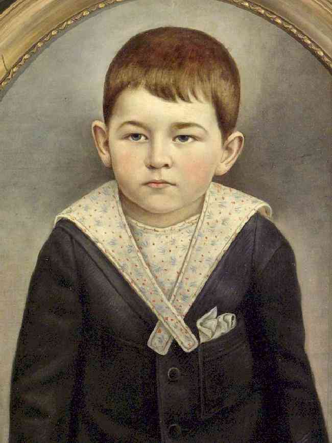 with an unusual collar. The collar is not like any I have ever seen before. Rather than detailed with stripes, it is done with some kind of pattern. As this is a paining, one has to ask about the accuracy of this depiction. An artist can of course paint what ever he wants. We believe this is an actual depiction. First of all, this is a commissioned portrait. I see no reason why a client would want an unusual collar painted. Second, painting this pattern would have been more time consuming than stripes. The artist's name might seem German, but the boy's sailot collar suggests to us that the boy may have lived somewhere in the Austro-Hungarian Empire. Perhaps our readers will know more. One reader writes, "I have the impression that there is something vaguely Northern European about the boy here, but I really do not have a good idea about where the portrait was taken." Another reader writes, "I seem to see a slight Asian look on the boy's face."