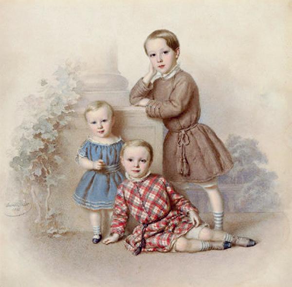 We note a charming portrait of the Redtenbacher children in a park (figure 1). We note nothing about the family. We belive they lived in Vienna and certainly look well-to-do. We do not have the boys' names. Their names are Leo, August, and Alexander. The boys are wearing tunics and dresses. One of the tunics was brown, the other a Scotch plaid. Note the waist cords rather than the more military-looking belts often worn. The portrait suggests that the tunic was an important garment for well to do Austrian children in the mid-19th century. Notice the plain white patalettes nd short striped socks. They are pictured in what looks like a park or grounds for an estate. Thus the outfits can be seen as appropriate for an informal summer outing. We are not sure about the date, but the note on the left margin seems to read 1850.