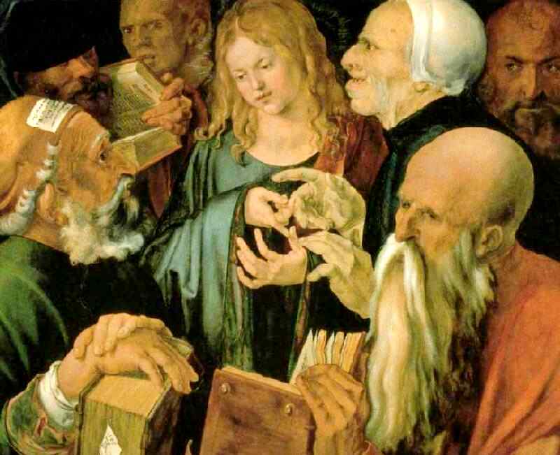 Apocalypse series (1498), have a Medieval Gothic look while his copper engravings seem more in tune with the Renissance. His earliest known work is a self portrait he made in 1584 when he was 12-13 years old. Art historians believe that his masterpices were the copper engravings "the Knight", "St. Jerome in His Study", and "Melencolia I" done in 1513-14. While Dürer is perhaps best known for his prints, he was also an important painter. Perhaps his most famous drawing is "Praying hands" as it has been reproduced in so many religious publications and hung in so many Church buildings. Another important religious work was "Christ among the doctors" about the youthful Jesus (figure 1). Here Dürer demostrates that he was the equal of the great Italian Renasance masters who he studied.