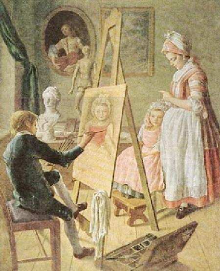 We note one especially interesting Firov painting. It is considered his masterpiece--"In the Studio of a Young Painter," signed later by the Losenko. This is Firov's best known painting and is of interst to HBC because it shows mid-18th century youth clothing. The setting may be the home of a Paris hair dresser where Firsov lived while studying in Paris. Ivan Firsov's "A Young Painter," painted in 1767 shows a young artist painting a portrait of a small girl, who sits on a stool with her feet on a little bench. She leans against her mother, who holds her still. The painting is of historical interest because there are relatively few 18th century Russian painters of importance. This image also seems so fresh and alive, the posing so natural.