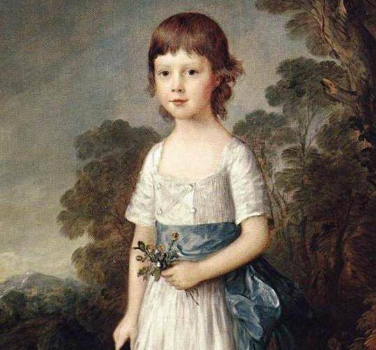 While Gainsbourgh's most famous portraits of boys were boys costumed in 17th century cavaler fashions, he also painted boys in contemporary styles. We see unbreeched boys in dresses. A good example is Master John Heathcote wearing a long white dress with a blue sash. Gainborough painted the boy about 1771. There is a very sad story behind the painting. John Heathcote was the son of an aristocratic parents. The portrait was painted when the boy was 4-5 in 1771 as a keepsake for the family who had recently lost ALL their other children in an epidemic. It goes to show wealth doesn't prevent tragedy. We notice three of the four Marsham children are wearing white Empire dresses. Younger boys wore dresses, but these seem to be three girls.