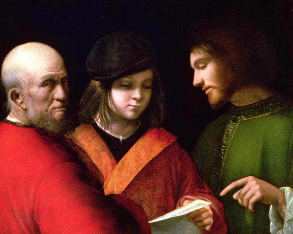 Venetian artist Giorgione is one of the great masters of the High Renaisance. He was not only a master draugthsman, but also a leading figures in the artistic revolution sweeping Europe. He was one of the first painters to paint people in a landscape setting. Giorgione was born in Castelfranco Veneto near Venice (c1477). At the time before the discovery of the Americas and rounding the Cape of Good Hope, Venice was at the center of the trade with the East. And the wealth created was part of what generated the Italian Renaissance. Virtually nothing is known about his childhood which most art historians see as suggesting humble origins. He is believed to have shown artistic talent from an early age. Giorgione was apprenticed to Giovanni Bellini--one of leading figures of the Renaissance (1490). Only incredibably talented boys would have been accepted as aprrentices. And in Belini's studio he was tutored in how to depicr lighting, atmosphere, color and mood. And the result wa virtually immeiate. While still a teenager, Giorgione produced his first two major works: 'Trial of Moses' and 'Judgment of Solomon' (1495-1500). Some after he painted 'The three ages of man' (1500-01), a brilliant dpiction of age. His most recognized work is 'The Tempest' (1505). About the same time he painted He painted many half-length portraits. Tragically has only a short career. He died at only 33 years of age, struck down by Venice dening us many master works (c1510).