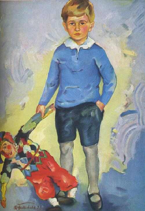 We know nothing about Robert Gottshalk, a German artist of the 1930s, at this time. We have one of his painting. It is a portrait of an unidetified German boy wearing a blue sweater with a white-collared shirt underneath, dark blue short trousers, and grey long stockings. He also wears strap shoes. He is depicted with one of his toys, a doll dressed as