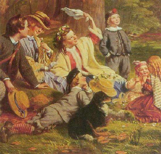 We note a number of highly idealized, rather emotionl paintings by Thomas P. Hall. The British might describe him dismissively as a "chocolate box" painter. He did several memoral naintings involving children such as the "The Altercation", "The Vacant Cradle", "The New Arrival", and "The Picnic". Most are relentlessly happy genre scenes (except "The Vacant Cradle"), perhaps explaining his continuing popularity. They are beautifully painted and provide very detailed depictions of the clothing children wear, especially his paintings done in contemprary times. We not only see detailed depictions of garments, but also Hall provids us color information which of course is lacking in the blck-and-white photography of the day. Unfortunately we have been unable to find any biographical information about Hall. One site suggested his dates were 1837-87, this may have been his active working life as a painter. Another source suggested c1810-c70. Hopefully readers will be able to provide some biographical background.