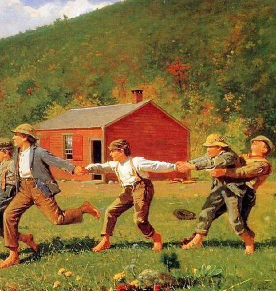 Winslow Homer at the mid-point of his career produce works depicting variously rural scenes of Northeast America, often children at play, as well as scenes from increasingly popular resorts, often fashionably dressed women. It is his quiet simplistic studies of rural American life in the mid-19th century that he is perhaps best remembered. Throughout all the tumualt of mid-19th century America, Homer has left us simple, but powerful images of rural life in a still largely agrarian country. The images of children are the most rememerable. There is no better depiction of rural American childhood during this period than Winslow Homer. The most famous is probably "Cracking the whip"(figure 1), but our favorite is "Huntsman and dogs" loaded on the previous page. These were water colors done after the Civil War in the 1870s, but depict more the children of Homer's own childhood before the War. We get the impresion that he was attempting to remember the more idealic America before the maelstrom of Civil War--the central event in American history. Henry James wrote of these paintings, "Barbarously simple. He has chosen the least pictorial features of the least pictorial range of scenery and civilization as if they were every inch as good as Capri or Tangier; and, to reward his audacity, he has incontstably succeeded." They are both wondrful images of childhood as well as important historucal documents in theur on right. And tgey recorded what ohotography could not yet do very well, life outside the photigrapher's studio.