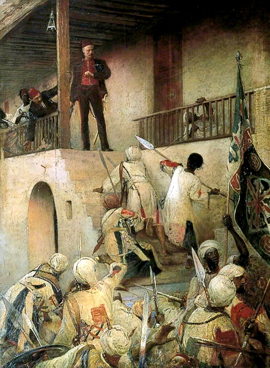 Major General Charles George Gordon was an army officer who became a major figure of the Victoria era, associated with the British Empire. He became known variouly as Chinese Gordon, Gordon Pasha, and Gordon of Khartoum. He first saw action in the Crimean War as a junior officer. He became famous because of his service in China. He was gicen command of the "Ever Victorious Army" a force of Chinese soldiers led by European officers (early-1860s). Gordon's commnd played a role in putting down the widespread Taiping Rebellion. They commoly faced much larger forces. As aresult he became a hero of Victorian Britain ad known as "Chinese" Gordon. He was awarded honors from both the Emperor of China and the British Army. He next entered the service of the Egyptian Khedive (1873). The British government concerned with the Suez Canal approved. The Brutisg wre also cincerned with suppresing the African slave trade and Gordon's effot added to his reputation in Britain, but not in Aran world where slavery had Koranic justification. Gordon was appointed Governor-General of the Sudan, part of a British-Egyptian condeminium. The slave trade was even more pronounced in the Sudan. The work was hllnging and an exhausted Gordon resigned (1880). Sudanese support for the slave trade was strong. And British efforts to suppres it stirred up resistance. As a result, after Gordon left, a revolt then broke out in the Sudan, led by a Muslim religious leader and self-proclaimed Mahdi, Muhammad Ahmad. It grew into a major revolt which threaened the British-Egyptian presence in Sudan. At the time Prime Minister Gladstone who had opposed the expansion if the British Empire on moral grounds wnted no part of a colonial war. The Brutish public, however, demanded action. Finally he authorized sending Gordon back to Khartoum, but with instructions to secure the evacuation of Britsh subjects and loyal Egyptians and Sudaese soldiers and civilians and to leave with them. He began by evacuating about 2,500 British civilians, but in defiance to those instructions, he decided to make a stand in the city, thinking this would force the Prime Minister's hand and force him to send a relief force. Grdon retained a small group of soldiers and non-military men and preared for battle. The two adversaries corresponded, each attempting to convert the other to his faith, but of course neither agreed. Despite the massive forces the Mahdi mustered around besieged Khartoum, Gordon managed to organized a defence which held out nearly a year. Gordon had calculated correctly. He became emensly popular in Britain and the public demand to save him finlly forced the Government to reluctanly send a relief force. It arrived 2 days after the Mahdi had taken the city and killed Gordon. Joy painted a heroic image of the end, although the exact circumstances are unknow. It emhaszes the heoic idea of a lone English manding up for God, king, and country and efforts to end the slave trade. Joy painted his work soon after Gordon was killed as a paen to the British Empire. The British left after finding Gordon dead. The British did not return until 1896 and a small force with modrn weapond destroyed the huge Mahdist army. The force was commanded by Lord Kitchener and included a Lieutenant Winston Churchill who prticipated in some of the last cavalry carges in British militry history.