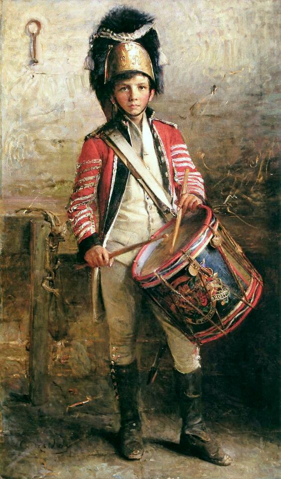Joy's painting of another Brirish drummer boy in 1902 also shows is admiration for the British (figure 1). Here there is no historical context as in the 'The Kings drums'. The British Army at the time was fighting the Bohrs in South Africa, but we are not sure wgat was on Joy's mind when he painted it and the plain background tells us very little. . One source suggests the boy is with the Royal Scotts Dragoons.