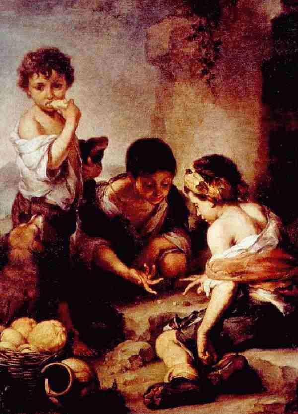 The paintings Murillo is best remembered for today are those of street children in his native Seville.  He sketched children both in the streets and at home.  He painted both the ragged boys and the flower girls of Seville.   There are no grand images of proud aristocratic children in fine clothes.  Murillo like Velazquez began his caeeer by painting realistic genre street scenes.  Unlike Velaquez, Murillo never suceeded in making grand court connections.  Murillo was especially noted for his paintings of street urchins ('Boys eating melons and grapes' and 'Boys playing with marbles').  The result are matchless realistic images of the everday lives of ordinary children in the Spain of the 17th century.  These pictures were generally done when Murillo was young and before he could command substantiall fees. The image here is 'Young beggers playing dice' (figure 1).  Another Murillo image archived on HBC is 'The Toilette' (1670-75).  Images like this of ordinry children are a very valuable addition to the historical record.