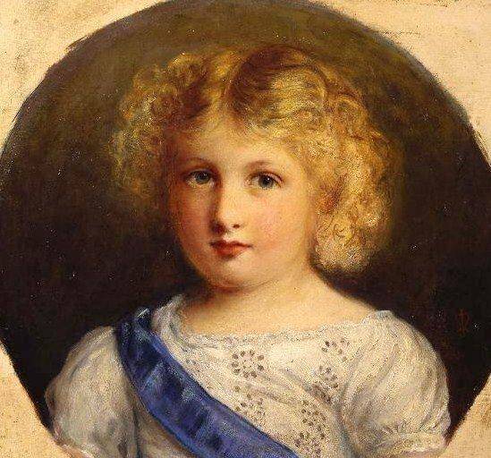Thi identity of the child here with curly hair is not known. The blue sash may well be allegorical and symbolic of Royal portraiture and the Order of the Garter. It is typical of the sugary style that Millais used to please his public. We are not sure how the boy is dressed. It looks like the bodice of a dress.