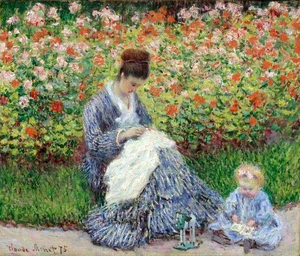 Camille Doncieux is important in art history, if nothing more than she appeared in so many of Monet's great works. She was still a teenager when Monet net her (around 1865). She came from a humble family. She was working as a model and presumably Monet was attracted by this attractive young woman with dark hair and expressive eyes. Monet mentions her eyes. Monet was 7 years older and still an unrecognized, struggling artist. She quickly became his mistress and model. It was common for men of Monet’s social class to have mistresses. It was uncommon to marry them. Their first son Jean was born (1867). Monet defying class conventions, married Camille just before the outbreak of the Franco-Prussian War (June 28, 1870). She went with him to London and Zaandam. After the War they moved to Argenteuil (December 1871). Art historians report that they lived little removed from poverty. Looking at the paintings we do not see poverty. Of course an artist can make things beautiful, but a poor child would not have worn a fancy dress or rode a tricycle. I think the reference to poverty is a relative matter for some one of Monet's class. Monet's family never accepted Camille. Both class and money were probably involved here. Monet struggled fincially all the time he was married to Camille. It was at Argenteuil that Monet painted many bimportant works. His wife Camille and son Jean figured in some of them. Camille became ill (1876). About this time Monet began seeing a mistress--Alice Hoschedé. His second son with Camille, Michel, was born (1878). The pregnacy weakened her at a time her health was failing. Even as she got sick, Camille sat for him regularly. There were portraits, but often she was a distant female figure in a beautiful rural landscape. Many of these works are among Monet's greatest paintings and masterpieces of Western art. She was also painted by Manet and Renoir. Perhaps no other woman has appeared in so many great paintings, Monet moved to the village of Vétheuil (1878). At the end, a priest was called to administer the last rites and to sanction their marriage. They had been married in a civil ceremony, mot in a church marriage. She died of tuberculosisat the age of only 32 years (1879). They had been very close, despite his mistressm and Monet was devastated. He painted her in death. She was shrouded in a veil of white and blue brushstrokes to preserve her memory and time together. We have not been able to find much information about the boys. We see Jean in several paintings, but there are very few paintings with Michel. Jean died at age 47 before his father (1914).