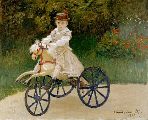 Claude was born in Paris (1840) and always considered himself Parisian. [Monet] He was the second son and called Oscar within the family. His older brother was Leon. His father took the family to La Harve, a seaport, for business reasons (1845). And it was there that Claude grew up. Monet re,embers both his indescipline as well as the appeal of the sun and sea. He writes, "... my childhood was spent at the Havre where my father had settled in 1845 in order to better pursue his own business interests and as it happened, this childhood of mine, was essentially one of freedom. I was born undisciplineable. No one was ever able to make me stick to the rules, not even in my youngest days. It was at home that I learned most of what I do know. I equated my college life with that of a prison and I could never resolve to spend my time there, even for four hours a day when the sun was shinning bright, the sea was so beautiful and it was so good to run along the cliff-tops in the fresh air or frolic in the sea." [Monet] His talent for caricature was noted as a boy.