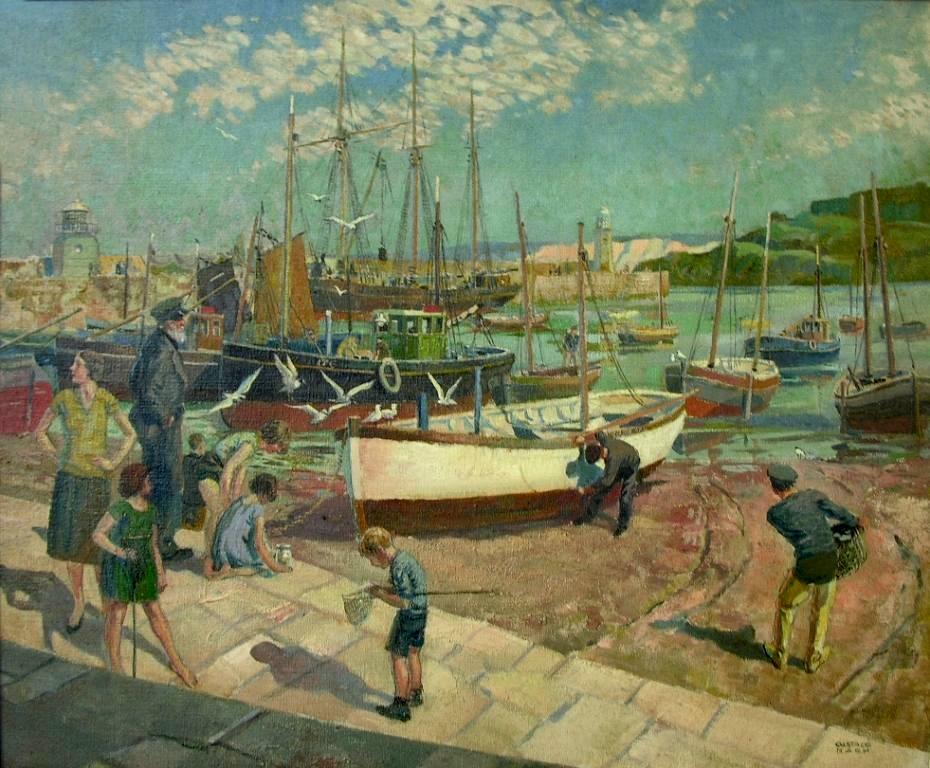 Eustace was born at Boscombe (1886). His father Fred Nash with a brother and associate published a weekly newspaper, the Bournemouth Observer. We do not know much about his childhood. He had a brother, Leslie. He is associated with the Channel coast, esoecially Dorset a little to he westt. The studied art at the school on Drummond Road in Bournemouth, studying under A Lister Lobley. He achieved success as a popular commercial artist. He produced a weekly cartoon for the Bournemouth Graphic, usually charactures of local figures (1920s-30s). He did a great deal of work for Bournemouth and Poole's publicity deparnent. And he did a lot of private commissions. He formed a close friendship with Leslie Ward. Both were founder members of the Bournemouth Art Club. Nash was a commercial artist by day, but then painted and drew in his free time. Nash did nunmerous paintings of local scenes. We see the Dorset countryside, Poole Quay, seafront cenesbus station, and much more. Nash and Ward exhibited at the Royal Academy. Nash exhibited his paintings at many other venues. Eustace married Phyllis Kemp (1927). Nash and Ward left awonderful visual legacy depicting scenes all over Dorset populated with local people including children. Dorset has become a popular tourist destination. Bournemouth is a lovely place as is Poole and Swanage. Some Americans may recognize Diorset as the location of the Famous Five stories by Enid Blyton.