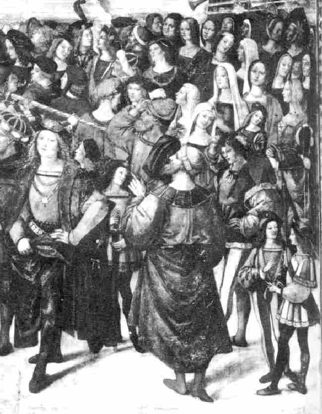 Bernardino de Betti is better known as Pinturicchio. He was born in Perugia in 1454 at the heigth of the Italian Renaissance. He was an assistant to Pergino and assisted with the frescos in the Sistine Chappel. He worked for 8 years (1484-92) on the frescos in chapels of the Santa Maria del Popolo in Rome. He also painted the walls of what is now the Vatican library. For our purposes here, Pinturicchio's work is notable for the Renaissance fashions that appear in many of his paintings. This depiction of the coronation of Pope Pius III (1503) by Pinturicchio is notable for the rich display of Renaissance fashion, including several boys.
