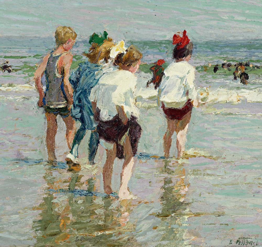 Edward Henry Potthast was an American impressionist artist. He was born in Cincinnati, Ohio (1857). He studied under Thomas Satterwhite Noble (1879-81) and continued his studies at the Royal Academy in Munich with the American-born instructor Carl Marr. He returned to Cincinnati and continued his his studies with Noble (1885). He then headed to Paris where he studied with Fernand Cormon (1886). Finally he haded for New York (1895). Here he remained and conducted his artistic carer. He is bstbknown for his destinctive broad brush stroke, colorful images of Americans enjoying their leisure in Central Park and especially on the beaches of New York and New England at the turn-of-the 20th and early 20th century. Many of his scenes include children cavorting at the seaside.
