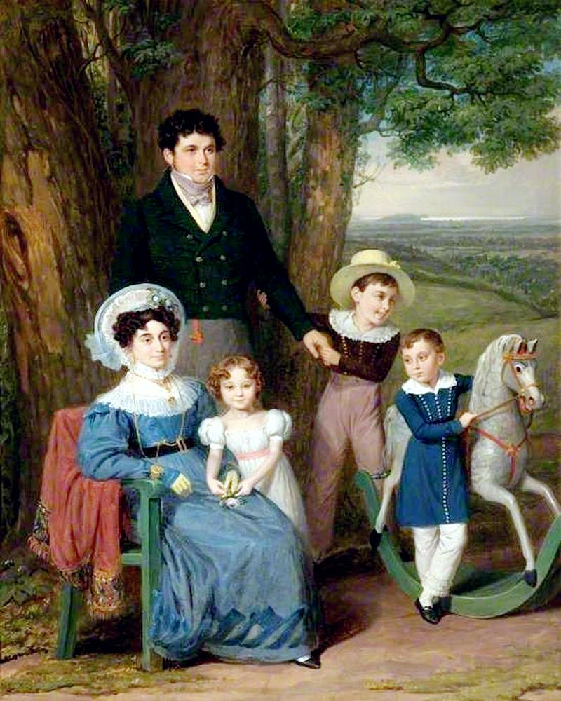 We have been unable to find any biographical information on this English artist. He was active during the late Regency and early Victorian eras and that he at least sometimes painted on wood. We have noted a portrait by him of Reginald Henry Bean with his wife Emma (daughter of J.R. Lucas of the Nailsea Glassworks) and family on the Backwell Hill painted in 1829. Clearly this is a prosperous family of the rising industrial class being created by the Indusrial Revolution. We have no further details about this family. The portrait, however, is a wonderful example of Regency clothing. Note the somber black and greys in Mr. Bean's so characteristic of Victorian men's clothing are beginning to appear already in Mr. Bean's outfit in contast to his wife's coloful dress. The boys appear to be wearing quite different outfits, but there are definite similarities. Notice the lace collaes and similar styling of the top of the boys outfit with vertical button styling. There certainly are differences. One boy wears a wide-brimmed hat with a high flat crown. The lace collars are tyled differently. The older boys wear long pants. The younger boys wears a tunic a huge number of buttons. Notice only one of buttons continues below the waist. With the tunic the boy wears what look more like pantalettes than pants/trouusers. The girls wear a long dress with long neckline and baloon sleeves. Notice how colorful the boys' clothing is. Both boys have short hair cuts. The gir has longer hair with some curls.