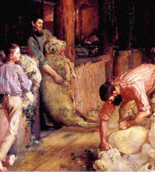 One of Robert's best known paintings is "Sharing the Rams" done in 1890 (fifure 1). The mainstay of the Australian economy were sheep. First the wool and later with refrigeration the meat became an important product as well. Here we see a young teenager presumably who has just left school working in sheraing shed. Australian boys like English boys routinely by the 1890s were wering kneepants. Many boys who had left school, however, wore long pants like the men.