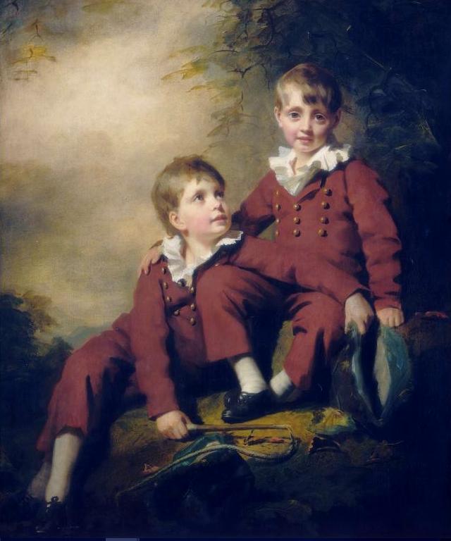 Here we see two brothers wearing matching skeleton suits, the Binning children. While we know their names, we do not yet know much about the family and the boys. Painted for the sitters' father, David Monro Binning [1776-1843], Argaty and Softlaw, Perthshire, Scotland; by inheritance to the elder son in the picture, George Home Monro Binning (1804-84). The boys wear skeleton suits with long pants that were the height of fashion in the 1810s. The jackets have an unsual three columns of buttons athr than the more common two rows foe double brasted styling. One boy is holding what looks like a blue beret type garment. In this case they appear to be purly ornamental. Even the center row does not seem to be closing devices. The material of the suit appears to be velvet. It is interesting to note that boys are almost always painted in skeleton suits during the early 19th century. Notice how short hair styles are the norm for boys. The colors do not look right to us. We expected a bright red. We hve, hwever, seen this color in other period images. We are not sure if this is an actual color or represents color shifts as a result of aging. Some versions showdraber suits than the one here.