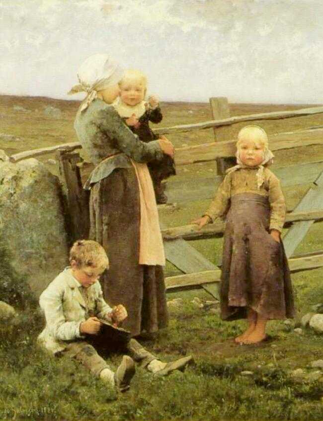 Hugo Frédérick Salmson worked in Stockholm. He is one of the greates Swedish artists, both for his skill and for his detailed depictions of Swedish like. He did not specialize with children like Larson, but children are feature in his depictions of Swedish life. One of his greates works is " Fête of Saint John in Dalecarlia, Sweden". It provides is fairly suggestive of the robust joy of the Scandinavian merrymakers, which depicts a Swedish celebration and costumes in great detail. We note another wonderful work, "Gateway to Dalby at Skane". He painted it in 1884. It is a wonderful depiction of how rural children dressed. Notice the boy's patched trousers and wooden shoes the barefoot girl.