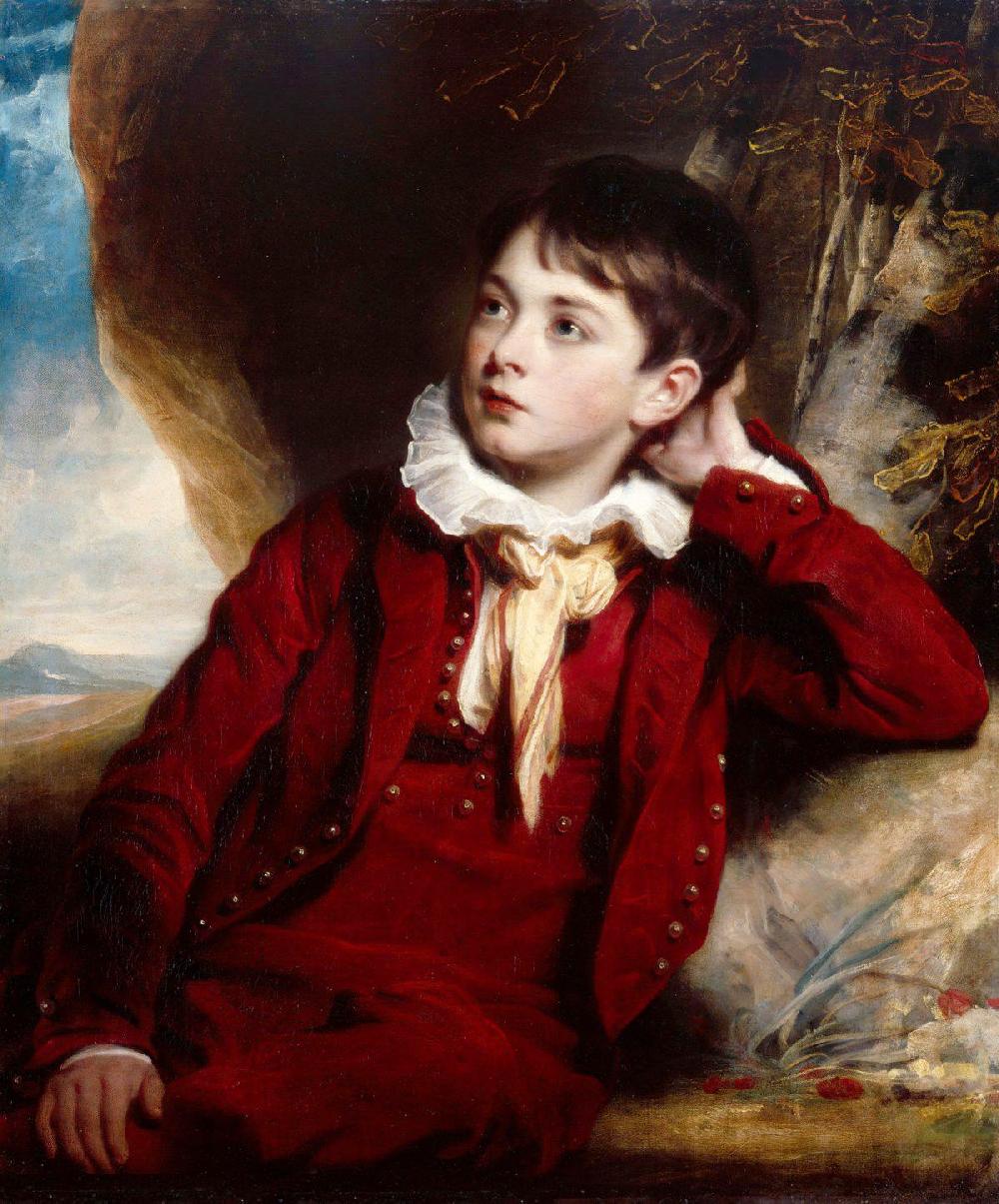 Martin Archer Shee was born in Dublin (1769), but as his career was conducted in England, he stands as one of England's great portraitist. Martin grew up in Ireland having a rather unsettled childhood, primarily because his mother died while he was just out of infancy. His father Martin Shee was a mildly successful, but not rich merchant. His mother Mary Archer died (1771). He received a classical education at a Dominican school in Dublin (early-1780s). He began studying drawing academy of the Royal Dublin Society (around 1783). He quickly distinguished himself winning most premiums. Given his obvious talent, he left home (1786) and quickly established a career as a portraits in pastels. He obtained commissions from elite society figures. Because his father had died and encouraged by his success in Dublin and some earnings to get him started, he decided to move to London with far greater potential to pursue his career (1788). Here he had a great advantage because a cousin, George Shee was a wealthy nabob. This provided entry to London high society and a long list of potential wealthy clients.Shee met Mary Power from Co. Cork, Ireland asd they became cerious. His career was in London, bt his hart apparentlywas still in Ieland. There was oppposition from both families. Mary's family did not think he had the means. His career was just getting started. But they married (1796). It prove to be a particlarly felicitos union. here were six children, three boys and three girls. We do not know much about them. We note a portrait of William, painted about 1820. We are not sure what he is wearing. We think it is a red skelton suit with a maching jacket. Shee is primarily known as a portratist but he also did a few genre paintings--refereed to as 'fancy' paintings at the time. He would go on to play an important role in he Royal Academy. His portraits include some of the most notably portraits of the monarchs of his life span except George III. He was anti-slavery, but as far as we know it did not enter in his work. Shee lived a long life and was active from an early age, earlier than for most artists. He ledft an incredible number of portraits as part of his bodfy of work. This means he provides us a wonderful chronicle of fashions for half a century.