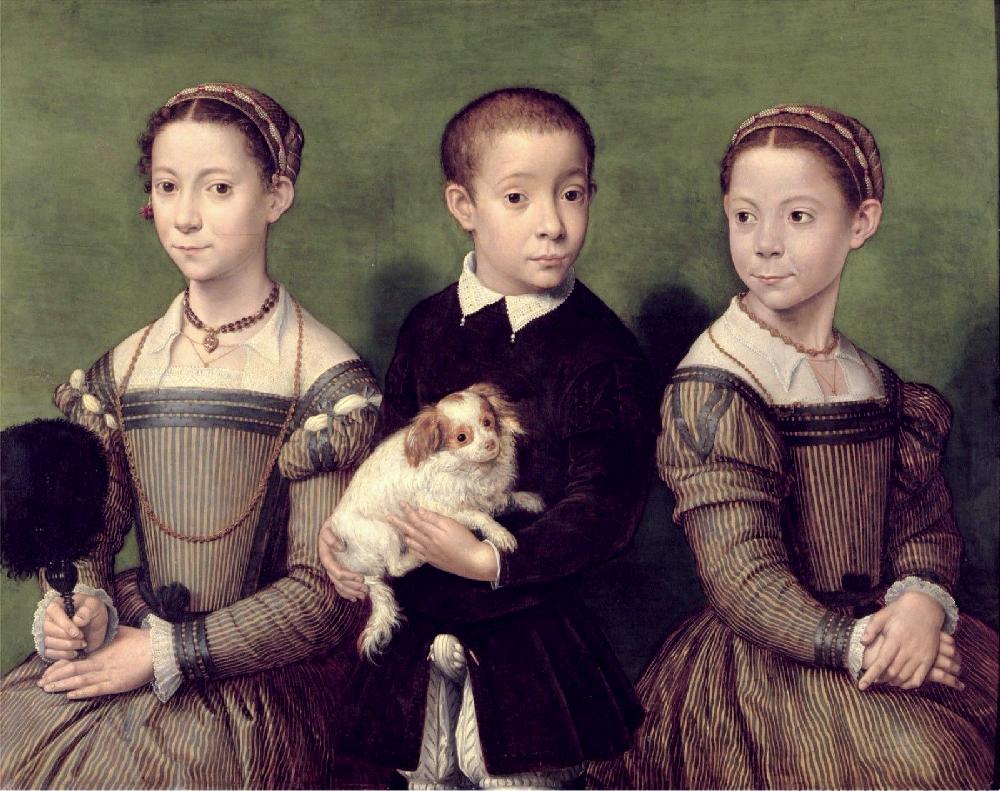Figure 1.-- This portrait is unmistakingly the work of Sofonisba Anguissola. It is often described as three children and a dog, but is a portrait of the artist’s sisters and brother painted about 1555. As a teenager and young woman, Anguissola wazs limited as to who she could paint. Painting strangers, especially men was out of the question. So she painted her family. They look to be the youngest of the seven Anguissola children: Minerva, Asdrubale (the only boy), and Anna Maria. Notice the wondeful expressions. You can tell so much about them. Asdrubale in the middle is especially interesting. He has a knowing expression, notice the raised eyebrows. Little Minerva looks like she is trying to hold back a giggle. Another portrait shows her giggling. These are unlike other Renaissance portraits of chilren are adults. We also have excellent good depictions of hair and fashion.