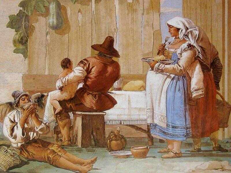 Giandomenico Tiepolo (1727-1808) was an Italian painter. His father was the well known painter Giambattista Tiepolo (1696-1770). We note a fresco that Giandomenico Tiepolo painted in Villa Valmarana, a mansion in the country of Vicenza, near Venice, in 1757. The fresco shows a peasant family's lunch. They are eating in open air. On the table there is the "polenta", a porridge made with corn flour. The polenta was the main food for the peasantry in northern and central Italy. It can be eaten with meat, fish, cheese, tomato sauce and many other foods. The poor, however, often ate only polenta. A pregnant woman is eating standing, a man seated on the floor and another man seated on a stool. This one has a little child on the left knee. The child don't wear any clothing. Among peasant people it was not infrequent that little children spent the hot summer days naked.