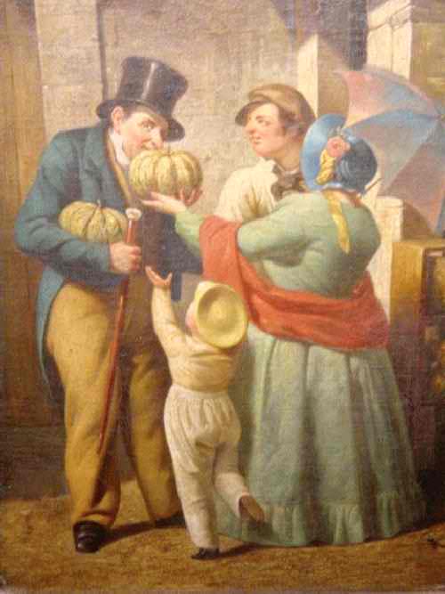 ![]() Figure 1.--HBC does not recognize the artist. We would guess the fashions are about the 1830s, perhaps the 40s. We are not sure, however, if it is a contemporary piece. As to the country, we would guess England or France, probably France." |