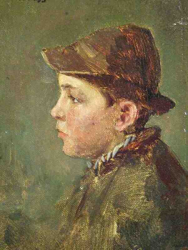 We have archived one portrait by Benjamin Vautier. It is a charming small profile portrait depicting a farm boy. He is unidentified and we do not know if he is Swiss or German boy and in any case there was little difference. . It is quite likely that the artist's son may have posed for the portrait. He is wearing a brown jacket and a brown hat with a brim. We believe that this is agood representative as to how farm boys dressed at the time. He is depicted on a dark background and the subdued colours or characteristic of the Düsseldorf School. The subdued background adds an air of tranquility to the portrait. The painting is undated, but was probably done in the 1870s.