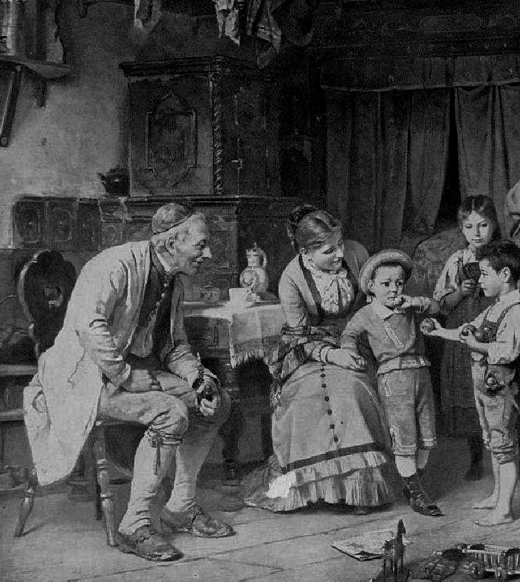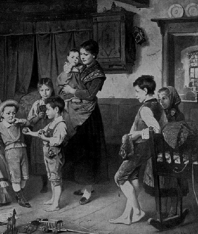 Marc Louis Benjamin Vautier painted naturalistic portrait of the peasant farmers and their families in Switzerland and the nearby German Black Forest. We see out doors imaages of their homes and fsarms. There are also fascinsting images of domestic life iniude their homes. One good example is the "The City Cousin" (figure 1). It is a classic subject, but we can see a comparison between urban and rural clothing. Much like Normal Rockewell, the scenes are idealized, but the clothing depictions seem very accurate And we see the children in their small one-room children. One charming image shows a one room school. We think this was a public school in a rural area. You can note in the floor the wooden shoes - possibly belonging to the barefoot boy - and a bird feather. Notably the Swiss were educating both boys and girls at the primary level. Switerland was a leader in public education and this included schools in rural areas. This was primarily the German influence. The Germans are the larrgest Swiss ethnic group. Germany and America were the two leaders in public education. These peasant images are charming and fascinating to look at. But the charm fails to bring out a fundamental issue illustrated here. The Germans including the Swiss Germans were very ineffiucent and unlike Britain and especially America and Canada did not moderize their agricultural sector. This would have emense consequences in the 20th century--especially in World War I and II.