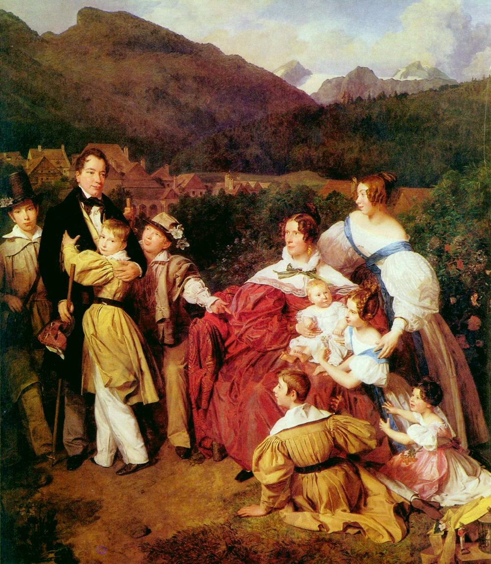Waldmüller painted a lot of genre images. This painting has the look of a genre image, but is actually a commissioned family portrait. The family is that of Dr. Josef August Eltz in 1834. It is unusual in that most family portrait were painted in or near the home. Here we have the family on vacation in the mountains. The family seems very well dressed for a mountain vacation. In addition to the mountain scenery we have wonderful details on how a well-to-do Austrian family dressed. We are not sure if this was affected by a montain vacation or this was simply their normal every day attire. The adults seem to be wearing normal attire, hardly chosen for outdoor mountain wear. Dr. Eltz wears a dark coat as was common at the time. He also wears light trousers, and dark cravats for daywear. The women's and girls' sleeves were gigantic, as large as they would ever get--huge gigot sleeve. The boys wear buff-colored belted knee-length tunics with yokes and full sleeves over trousers. We suspect that this was seen as outfits suitable for the nountains nd outdoor activities. The girls wear white dresses with colored aprons, again we suspect this was seen as outdoor activity wear--at least for boys in well-to-do families. Waldmüller left us several peasant genre images and peasant children clearly did not wear tunics.
