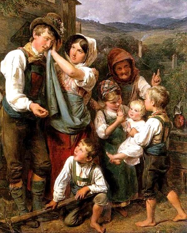 Here we can see a young peasant family from a painting by the Austrian painter Ferdinand Georg Waldmuller. We are not sure when the family was painting, probably about the 1840s. Paintings are usually dated so we should eventually be able todate it. We seen four young childen to aboyt 6-7 years of age. Lederhosen and bare feet were the norm for Austrian peasant children. The Lederhosen are the long type mase like 18th century knee breeches. Folk clothing styles did not change rapidly like main-stream fashions andthus can not be easily dated. . The boys are dressed identically. Notice that their H-bar halters are not crossed in the back. Notice thst father and the boys wear identical outfits eceot that father has shoes. The younger firls seems to wear a long green pinafore.