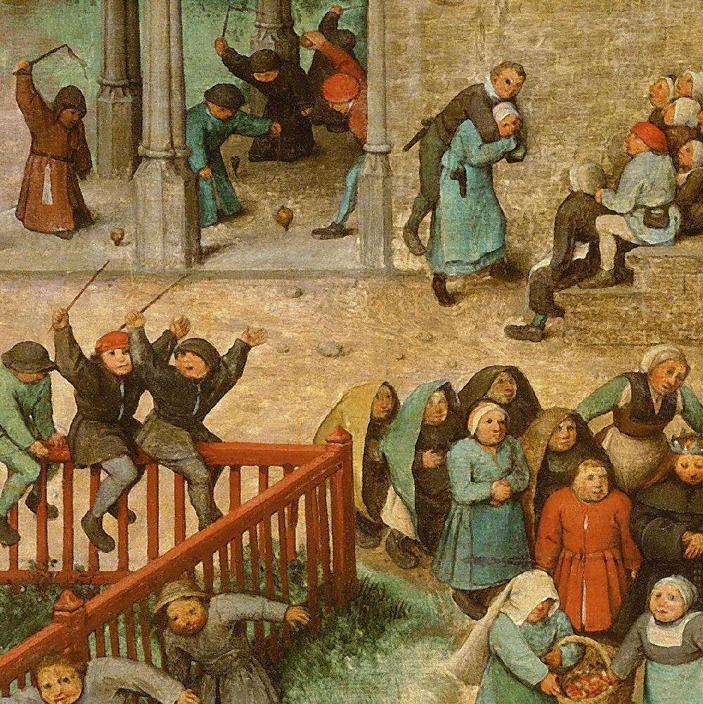He finally settled in Brussels. Art historians see him as the greatest of the Bruegel clan. His life is almost coincident with the Reformation ans the influence of the Reformation is powerful. This can be seen in the humanizing spirit to traditional subjects and bold innovation, especially the value he gave to individuals, especially those of the lower order. No one embraced the peasantry like Bruegel. He is of special interest to HBC because of his wonderful painting of peasant children playing (figure 1). It is not an actual scene, but a canvas for depicting the varied play activies of peasants in the 16th century.