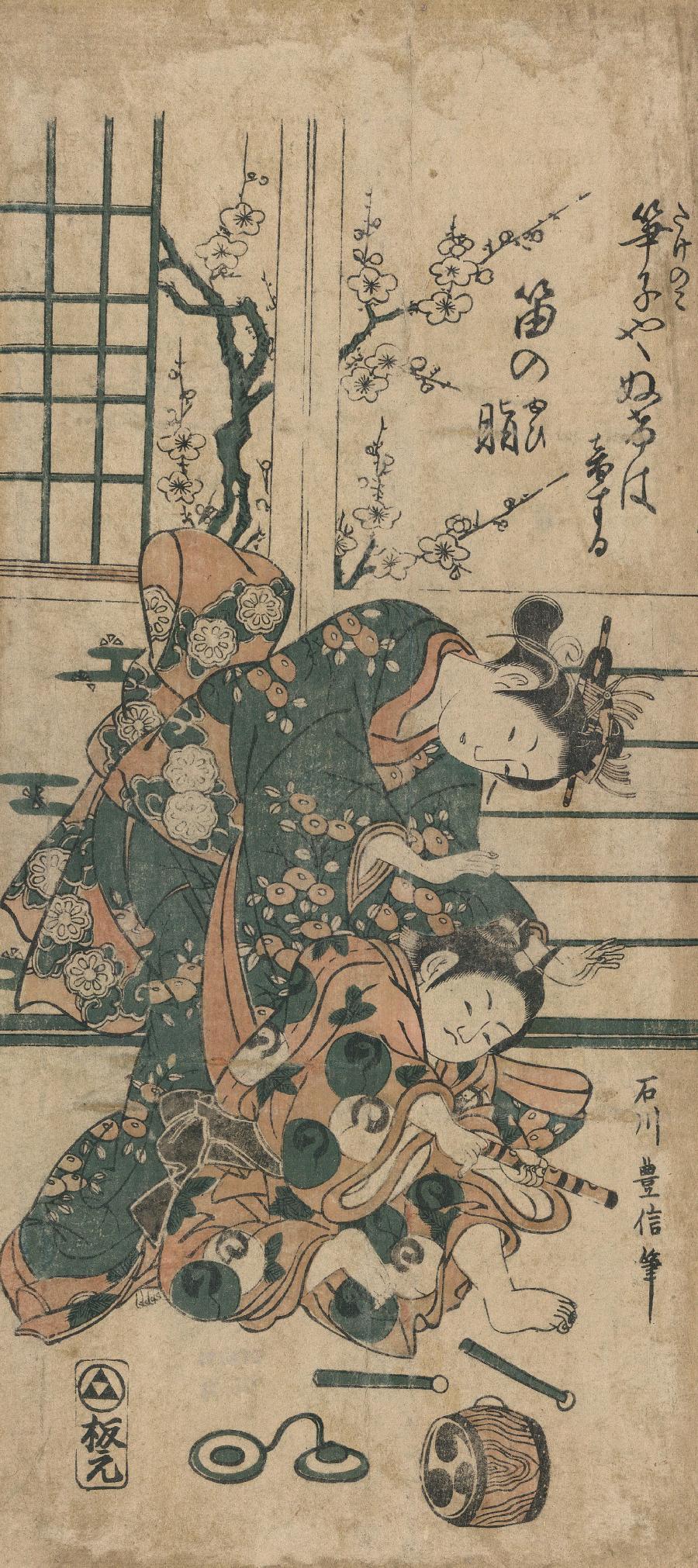 Here we have an Edo print entitled 'Ane ototo no isakai' (Brother and sister). The artist was ToyonobuIshikawa (1711-85), a highly prolific print maker. Unlike important Western artists, very little is known about him. This is geberally the ase of Japanese artists before the modern age. They did not have the same social status as Western artists. It was created some tome about 1751-64. He specialized in Ukiyo-e, meaning images of the hedonistic culture develing in Edo in the 18th century. He specialized in images of beautiful women, actresses and cortesans, including a few mostly seni-nude images. It shows a young woman, presumably a mother, with and a young boy playing with his toys. Toyonobu emerged as one of the leading producers of color prints, chiefly benizuri-e (rose prints). The image here is a good examole, only two colors including rose (figure 1). He stopped producing his ukiyo-e shortly after Suzuki Harunobu began producing full-color print (nishiki-e) (1765). He is known to have only one important pupil, Ishikawa Toyomasa, who is known primarily for depictions of children at play. He may have been Toyonobu's son. The print is held in the Japanese prints and drawings collection of the Library of Congress.