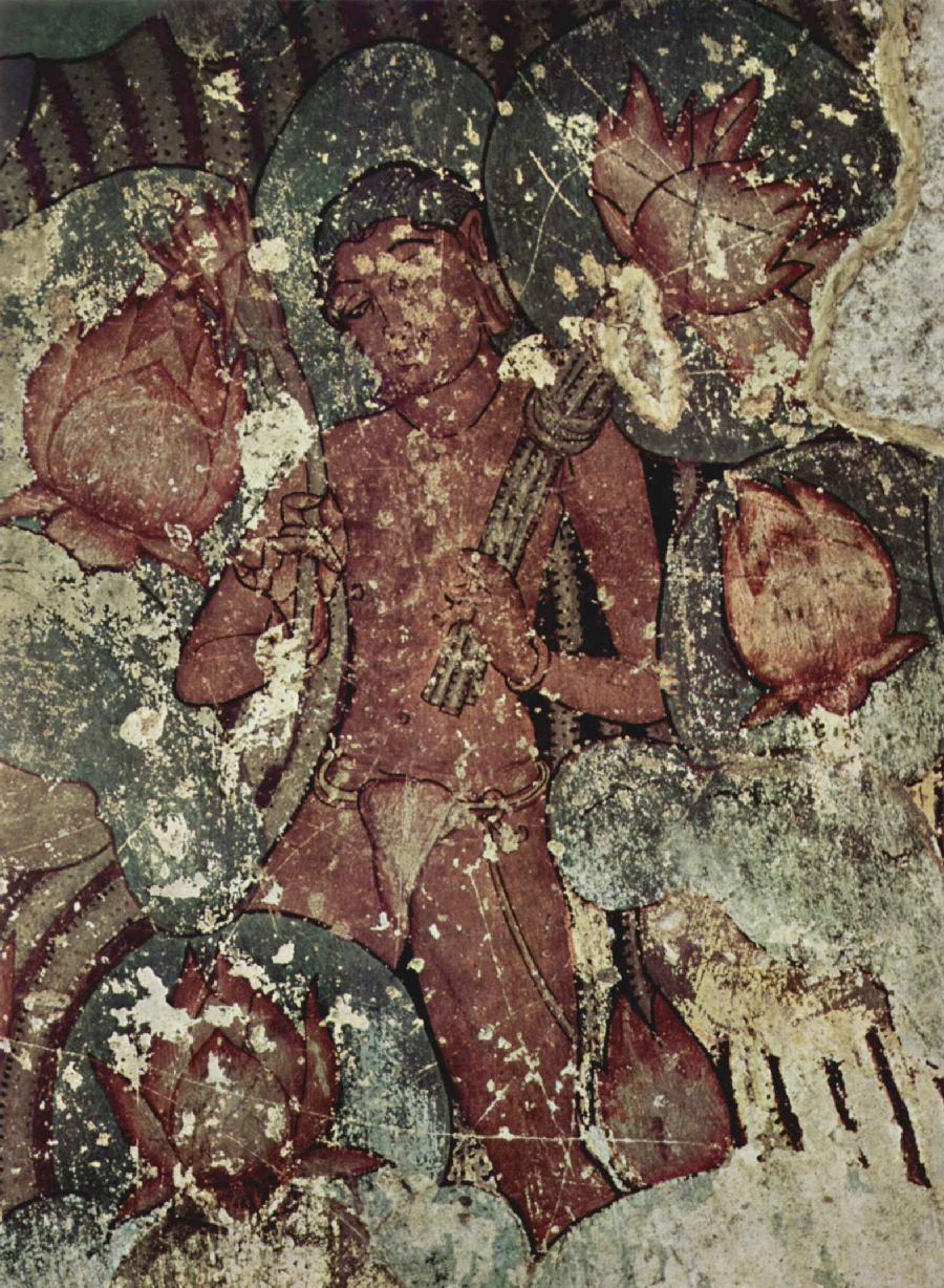 The earlist painting other than the cave paintings seems to be found in Buddhist literature which describe palaces of the military and aristocratic class decorated with paintings. These appear to be paintings on walls as was the primary form of paintings at the time. The Ajanta Caves are the most significant of actual surviving early Buddhist paintings. Art scholars believe that small-scale painting was executed in manuscripts like European illustrted Bibles, but the only surviving examples date from the medieval era. Murals appear in ancient and early medieval times (2nd century BC to 8th – 10th century AD). Large scale wall painting anf frrescps dominated Indian art for an extended period. Here we see a beautiful example (9th century).