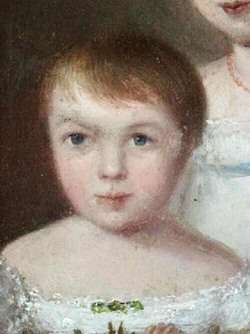 Two of the children wear colored dresses. I am not sure about the significance of the pattern.cilors. One boy has a plaid dress which of course suggests a Scottish kilt--a boy's garment. The other boy wears a blue dress. Here I am not sure. We believe that modern color conventions were not yet established. These dresses do not have balloon sleeves. The choice of the dresses is interesting. It is almost certain that the mother selected them. The artist certainly would not have selected a plaid dress. Plaid is complicted to paint. We believe that white and colored dresses were selected to diferentiate the boys and girls. This does not mean that the girls always wore white dresses and the boys colored dresses. In fact we suspect that the boys as the two yhoungest children wire their susters old clothes. As a portrait was a special occassion, however, they might have had new dresses purchased. Also these two children do not have necklasses. Their hair is slightly shorter than the other two children and no effort has been made to curl it. The features of these two children also appear boyish. We believe that they are both boys.