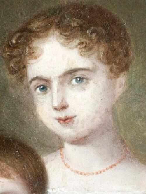 Notice that the two of oldest children wear white dresses and that they have both probably have balloon sleeves, only we can only see those of the girls in front. Also they have necklasses. We believe that they are girls. Also their hair is not omly slightly longer than the other two children, but appears to have been done with clearly observable curls. The features of these two children also appear girlish.