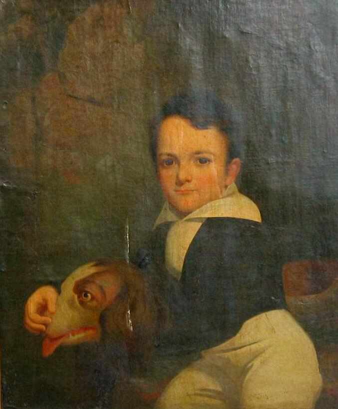 Figure 1.--Here we have an unidentified English oil portrait. It is clearly a mid-19th century portrait. We would guess it was painted about 1840, probably the late 1830s or early 40s. We welcome any reader insights here. The potrait shoes a boy about 10 years old with his dog. The boy is well drawn, but the dog more amateurishly. |
