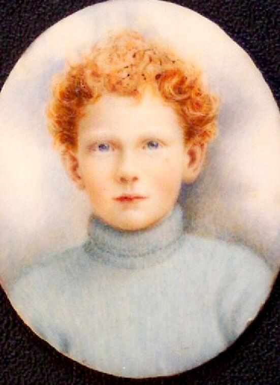 Here we have a fairly modern English portrait, even so we do not know who the artist was or weho the boy painted was. We believe that it was painted in the 1920s. It is a striking portrait of a red-haired boy about 10 years old. The British would say ginger-colored hair. He wears a turtle-neck light blue sweater. This is a wonderful minature, painted on ivory in watercolor. It was housed in its original silver and paste set frame, the visible size of the image is 1 1/2 x 1 1/4inches. There are no biographical details or signature.