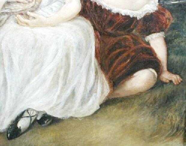 We know virtually nothing about this portrait. The artist and the children are unidentified. The artist seems reasonably proficient, although we would say he did a better job with the girl's face than the boy's face. There would seem to be some difference in the age of the children. We would guess that the girl is about 15 years old and the boy about 6-7 years old, but this is only a rough guess. It almost certainly is an American portrait. The vegetation suggests the South to us. The portrait was for sale in a North Carolina auction. We are not sure about the date, but would guess the 1830s. The children look to be an older sister and a younger brother. Both children wear dresses with some similar stylistic details. Both dresses are made with low necklines. The boy's necklline is almost to his shoulder and is trimed with lace as is the sleeves. Both dresses have baloon sleves. The boy's dress is shorter than his sister's dress. This may be a reflection of age rather than gender. As far as we can tell his dress is no different in style from what a sister his age would wear. The material of the two dresses look different. The boy's dress looks to be a velvet dress.