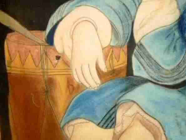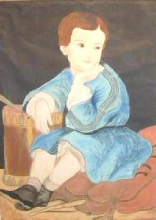 Here we have a watercolor. The boy is unidentified and we have no idea who the artist was. It is undated, but we would guess it was painted during the 1860s. The puffslleves under the sleeves of the dress were a popular style in the 1850s and 60s. The boy is pictured with his drum wearing a blue dress. The dress has black stripe detailong on the long sleeves and repeated on the front of the skirt. The boy has pantalettes and short socks. His hair is down to his ears.