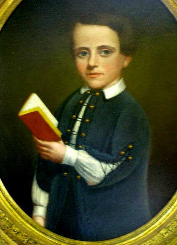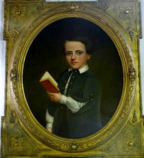 Here we have a portrait of an American boy about 8-9 years old by an unknown naive artist. Unfortunately the boy is unidentified. And we have no idea where in America the boy was from. He wears a jacket with short sleeves and ballon sleeves. Note the lacing on the sleeves. We are not entirely sure sure when the portrait was painted. I think it is clearly pre-Civil War. We suspect the 1850s, probanly the early 50s. We think the 1840s is also possible, but we do not know enough about the 1840s to say yet. We have not found any photographs with a jacket and skeeves just like this which is one reason we think the late 40s or early 50s is the approximate time the portrait was painted. This would be the years that the baloon sleeves were popular. We are less sure about the laceing. The small collar is also notable. This was a popular style in the 1850s and 60s.