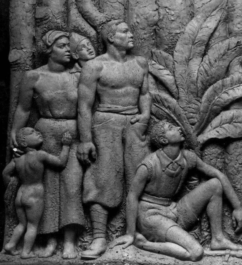 The bas-relief is a good example of Fascist art. We see similar German sculpture and some similar New Deal sculpture in Americans. Some New Dealers were impressed with Mussolini and Italian Fascism. Fascist art liked to glorify workers, espcially rural workers who were seen as more a part of the nation ethos than industrial workers who were contaminated with left-wing ideology. Italy's Fascist dictator, Benito Mussolini, was in sharp contrast to Hitler, personally uninteresred in art. He was interested in propaganda. The clothing worn by the older boy and the man seems accurate. On the contrary, a woman with bare shoulders doesn't seem realistic. The nakedness of the younger boy can be both symbolic as well as an acurate depiction of rural Italy.