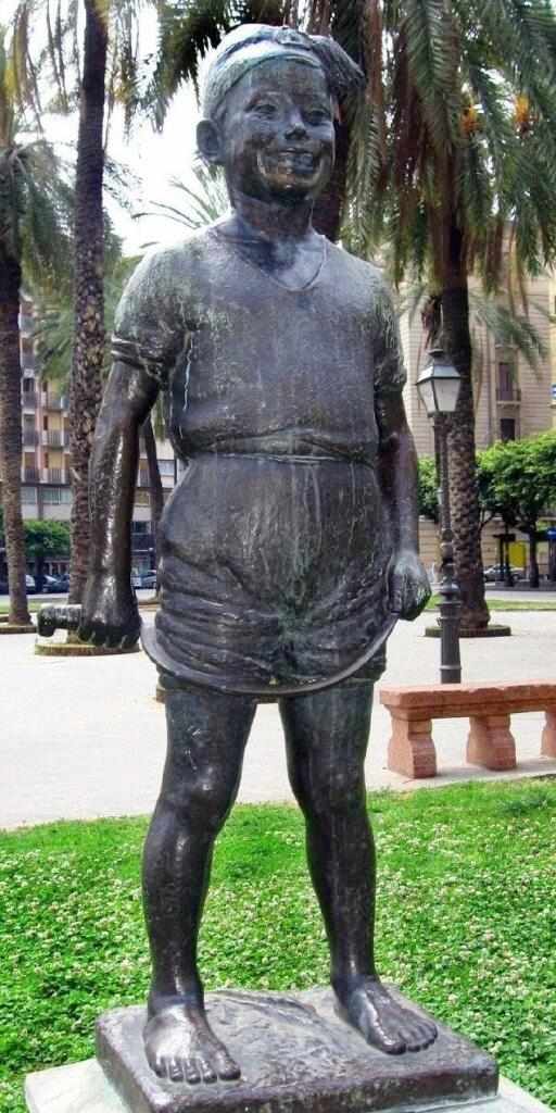 The photo shows the statue "The Balilla" by the Italian sculptor and medalist Antonio Ugo (1870-1956). He was born and grew up in Palermo. The statue is placed in an important square of Palermo, near the Politeama Theater. It is a tribute to the Balillas and to the "Wheat battle" (Battaglia del grano). The Wheat battle was a campaign that the Fascist regime started in 1925 to increase wheat yield. The "Opera Nazionale Balilla" was established in 1926. The statue shows a boy wearing the fez, shorts and t-shirt. He is holding a sickle. With his bare feet and his smile, this Balilla is an image of the simple and healthy life of the Fascist propaganda.